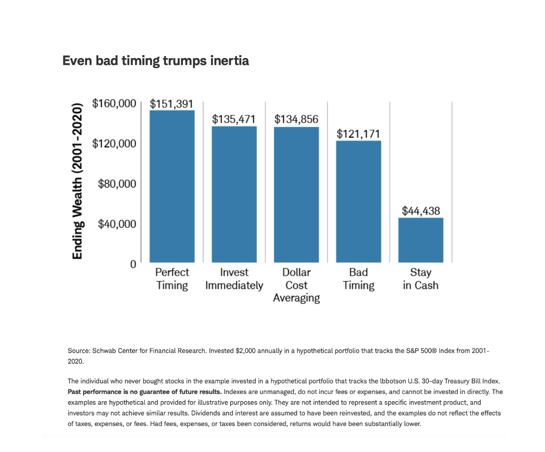 A recent study by Schwab Center for Financial Research found that bad market timing is worse than investing immediately, regardless of the market conditions at the time of investing. This indicates that even in market downturns, or just before a downturn, investors who invest immediately and remain invested will be better off than those who stay on the sidelines or attempt to time the market.