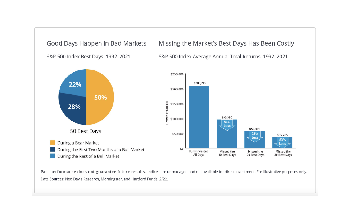 Another graph by Hartford Funds and Morningstar shows what happens if you miss the best days in the market, which often closely follow a major downturn and can be just as difficult to predict. An investor who missed the 10 best days in the market between 1992 and 2021 would have earned 54% less than someone who was fully invested during the same time period.